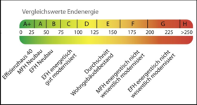 In einer Immobilienanzeige sind bei Verkauf und Vermietung eines Wohngebäudes Angaben zu den energetischen Kennwerten des Gebäudes anzugeben. Dies beinhaltet auch die Angabe der Energieeffizienzklasse (Klassen A+ bis H).